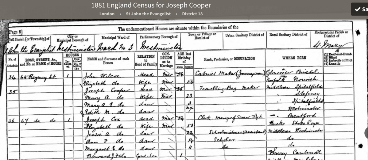 1881 Census–Joseph Cooper & Family Published January 20, 2020 at 2260 × 984 in Packing My Traveling Bag ← Previous Next → 1881 Share this: Share on X (Opens in new window) X Share on Facebook (Opens in new window) Facebook Email a link to a friend (Opens in new window) Email Like Loading...