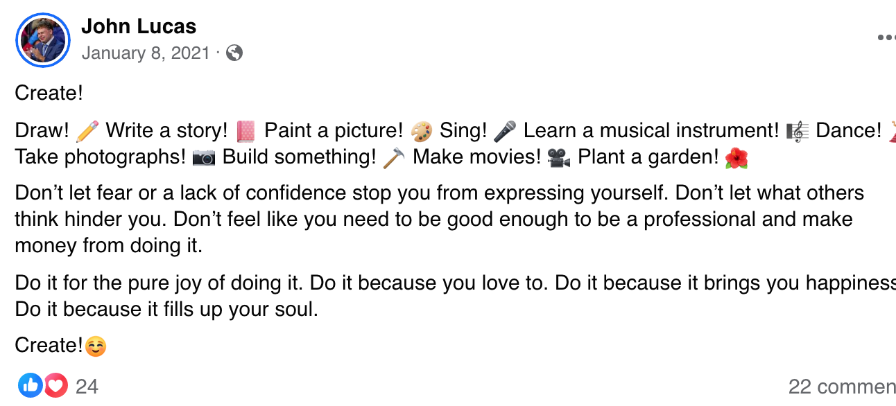 I couldn’t find Jeannine’s meme, but I did find this inspiration from my good friend John Lucas which I wanted to share. These words might give you some inspiration, as well.